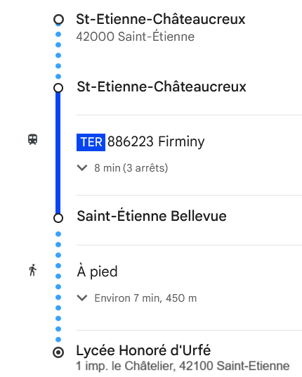 En TER (15 min) : Entre Gare Saint-Etienne Châteaucreux et Gare Saint-Etienne Bellevue.